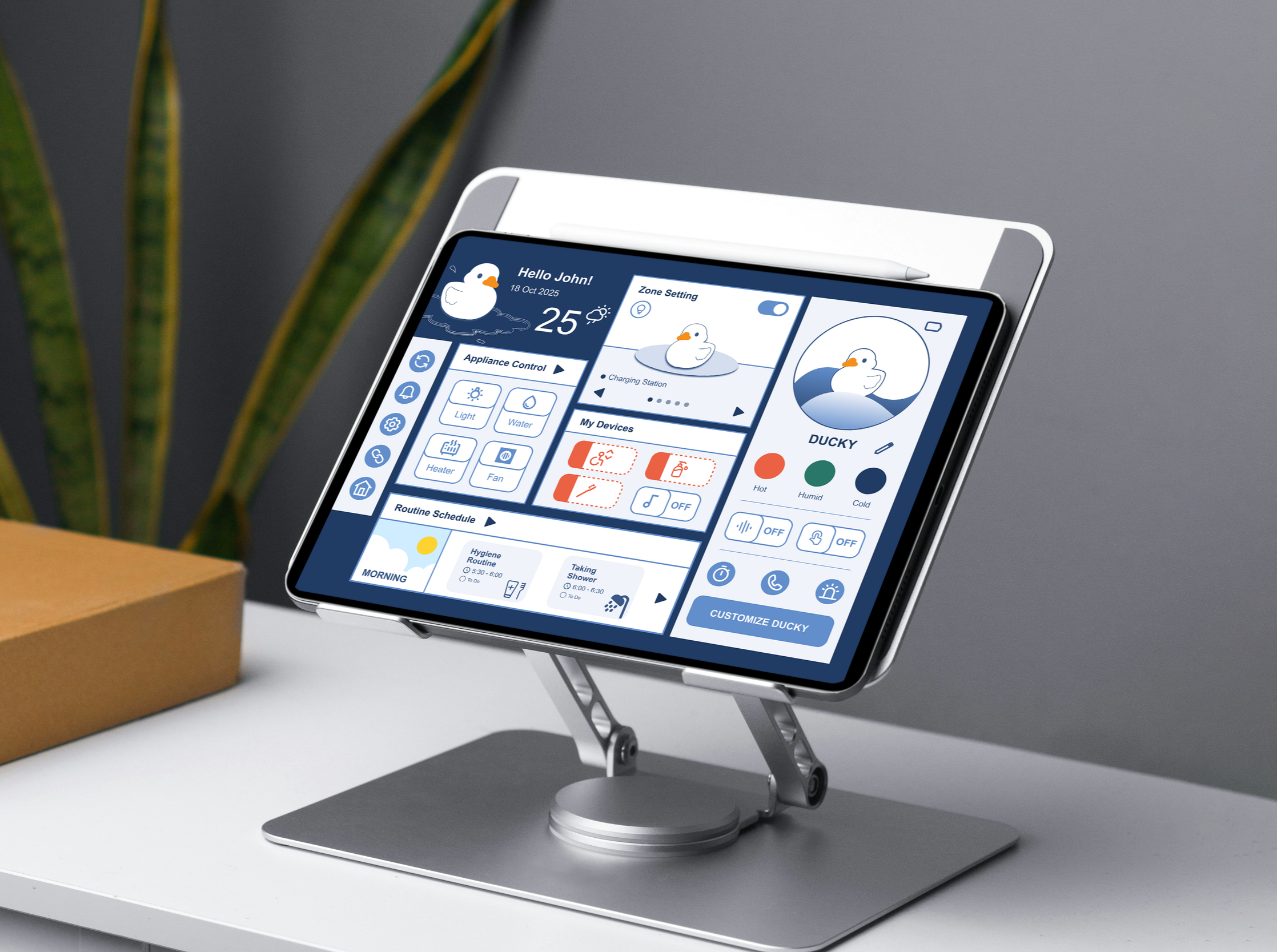 DUCKYS is a safety bathroom system that supports safe, intuitive bathroom routines for older adults. It combines sensor surfaces, a ducky companion, and a tablet application for remote control and customize.