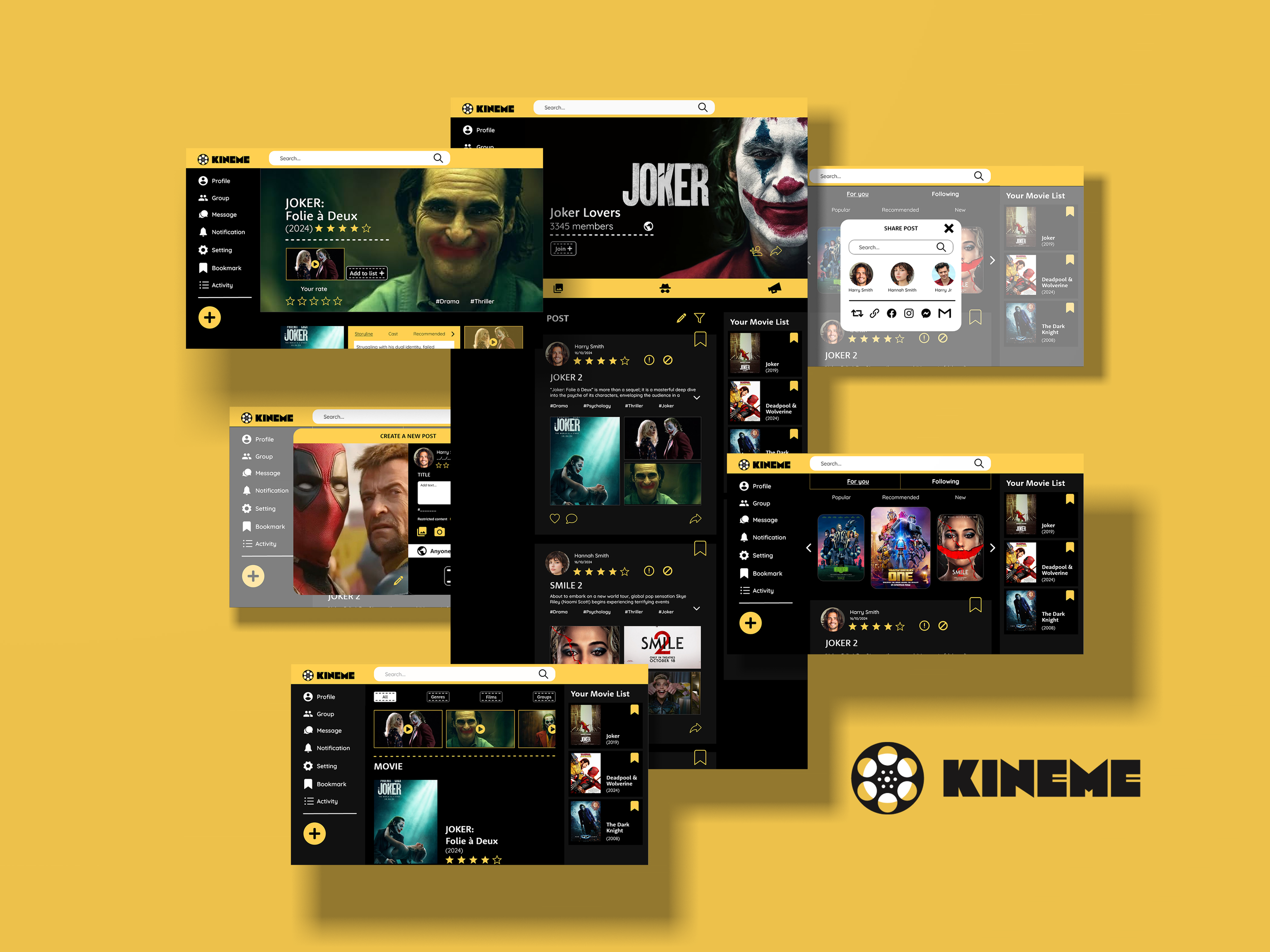 Kineme is a digital storytelling application designed for movie lovers aged 30–40, offering a rich, community-driven experience before, during, and after watching a film. More than just a review site, Kineme helps users explore movie genres, dive into fan-rated analyses, and discover deeper insights into cinematic universes. It also enables users to curate and share personalized movie lists, favorite posts, and trending content across platforms and social media.